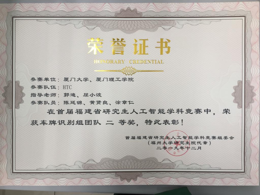 2019年12月,在首届福建省研究生人工智能学科竞赛中,CSG学生涂章仁及其他同学陈延锦、黄贤良(指导老师:屈小波,郭迪),荣获车牌识别组、声纹识别组团队二等奖。