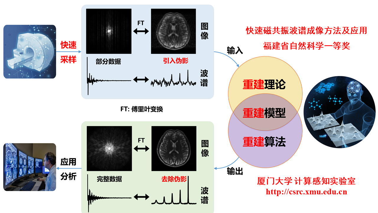 《快速磁共振波谱成像方法及应用》项目,从磁共振的指数信号、图像自适应稀疏表示和人工智能出发,建立了一套突破采样准则且具有国际先进性的快速磁共振波谱成像方法。旨在推动磁共振生物医学成像与信号处理方法的发展,为国产高端磁共振装备的关键技术突破和创新提供重要理论、方法和技术支撑。该获奖项目技术基础雄厚,特色鲜明,相继获批过国家重点研发计划数字诊疗装备课题、国家自然科学基金重点项目/国际合作重点/国家优青、福建省杰青等重要科研/人才项目,所提出方法被多家国产高端磁共振生物医学设备商和研究机构等产业化和科研应用。有力推动了国产高端医学成像装备解决快速成像瓶颈问题,为信号处理和生物医学成像方法发展做出了重要贡献。