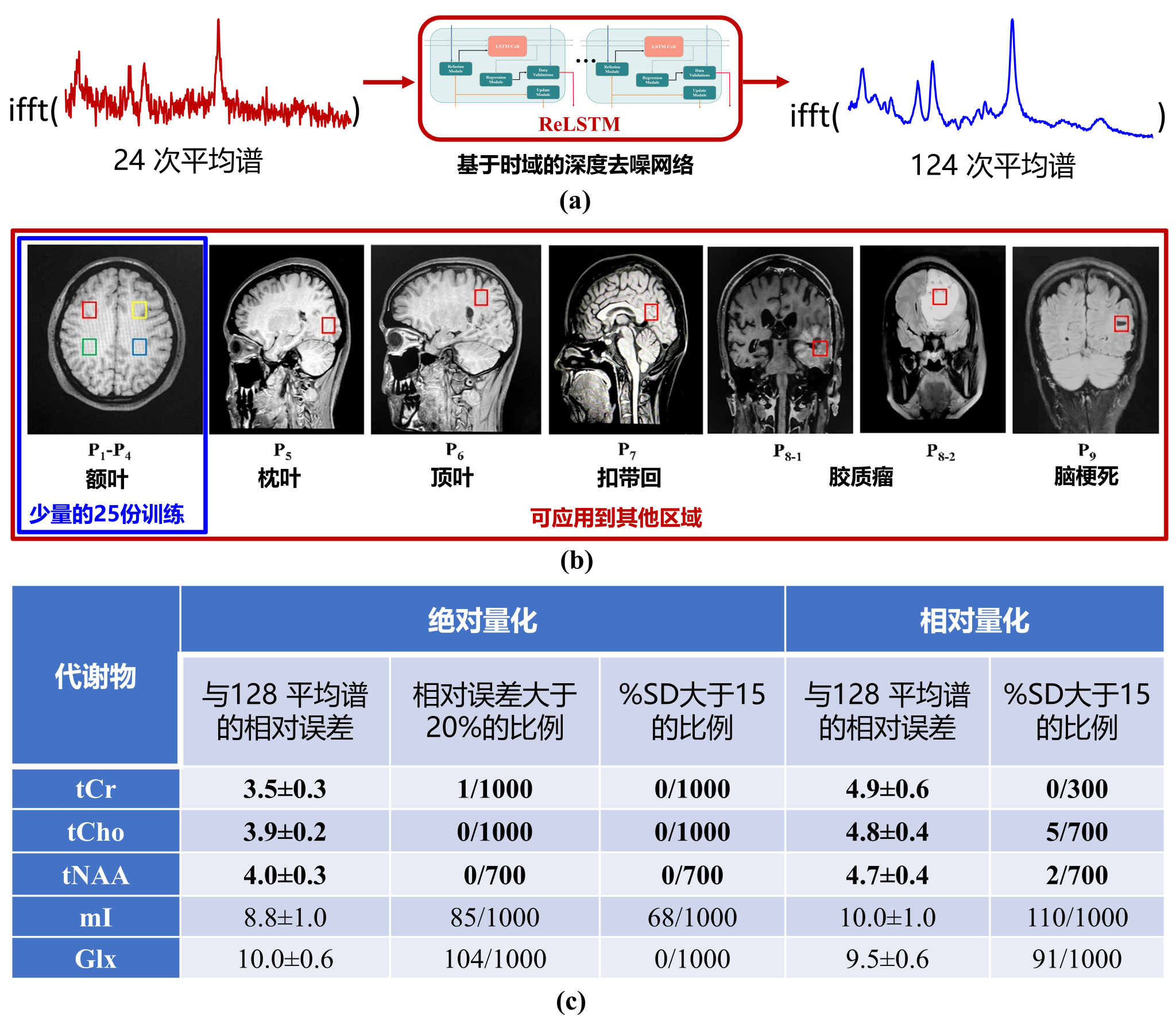 图1. 人脑代谢物磁共振波谱智能去噪。(a) 重熔长短期记忆神经网络ReLSTM学习从低信噪比(24次平均)到高信噪比(124次平均)的映射,ifft为离散反傅里叶变换,把波谱转换成对应的时域信号进行处理,(b) 脑部波谱数据采集区域,(c)主要代谢物定量分析。