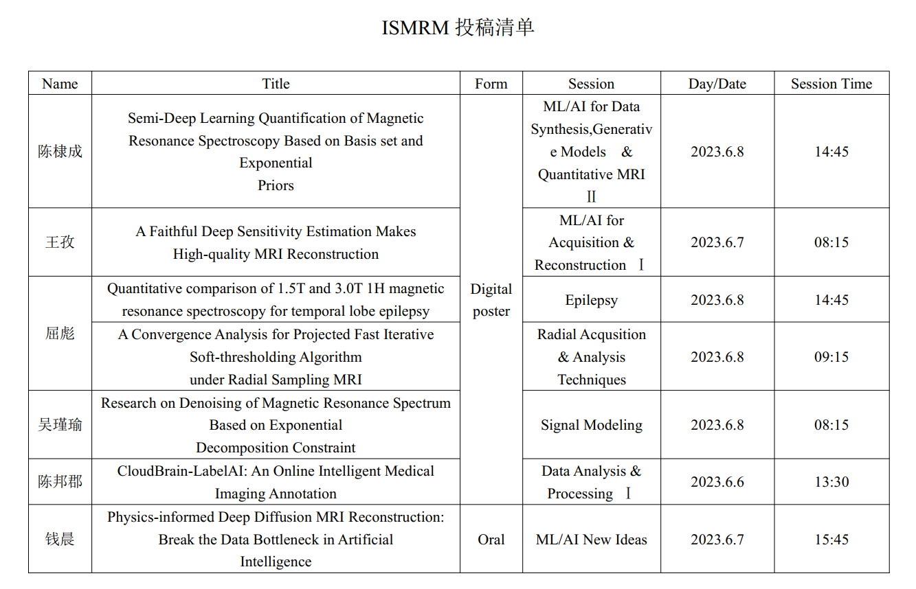 实验室在本次ISMRM接收7篇摘要,涵盖磁共振物理智能成像、快速智能成像、磁共振波谱智能定量、临床疾病分析、智能云脑平台等行业前沿内容。这些工作以口头汇报和海报的形式在大会上进行了广泛展示,受到全球专家和同行的广泛关注和热烈讨论。通过合作研究和学术交流,促进医学磁共振技术在临床实践中的推广和应用,更好地造福于广大患者。