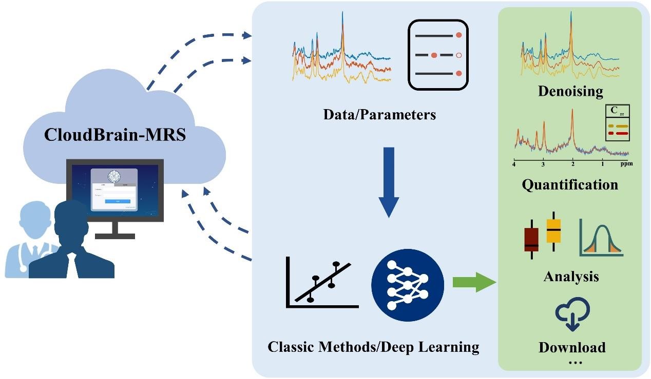 为了解决这个问题,计算感知实验室开发了磁共振波谱定量分析平台 CloudBrain-MRS。这是一个基于云计算的在线平台,提供强大的硬件和先进的算法。该平台只需通过浏览器即可访问,用户无需安装任何程序。CloudBrain-MRS 还集成了经典的 LCModel 模型和先进的人工智能算法,并支持对来自不同供应商的 MRS 数据进行批量预处理、量化和分析。此外,该平台还提供以下实用功能:(1)自动统计分析,寻找疾病的生物标记物;(2)经典量化算法与人工智能量化算法之间的一致性验证;(3)彩色三维可视化,方便观察单个代谢物谱。最后,健康受试者和轻度认知障碍患者的数据被用来展示该平台的功能。这是首个支持使用人工智能算法处理活体 MRS 数据的云计算平台,已共享在 MRSHub 社区,提供至少两年的免费访问和服务。如果您感兴趣,请访问 https://mrshub.org/software_all/#CloudBrain- MRS 或 https://csrc.xmu.edu.cn/CloudBrain.html。