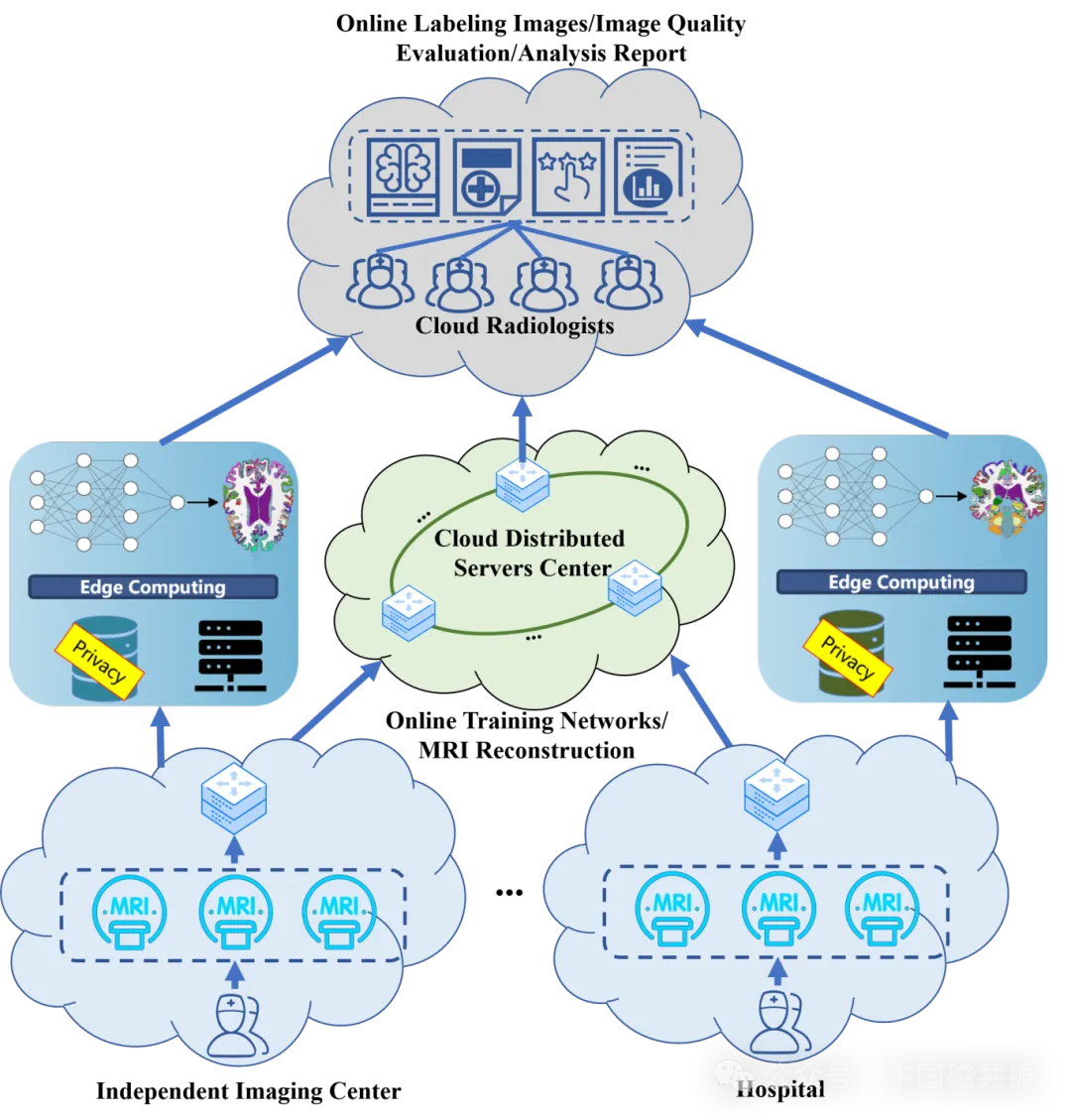 该研究提出了Cloud-MRI系统 (图1),这是一个前瞻性的解决方案,整合了分布式云计算、6G带宽、边缘计算、联邦学习和区块链等技术。通过Cloud-MRI系统,k空间原始数据可以以统一的ISMRMRD格式通过命令行上传到云计算服务器或本地边缘节点,实现快速图像重建、物理信息合成数据训练等高级任务。结果可以通过浏览器或移动设备分发给各地的云放射科医生,用于诊断疾病并撰写报告。放射科医生可以轻松获取高质量的成像数据和先进的AI支持,从而提高医疗诊断准确率和效率。