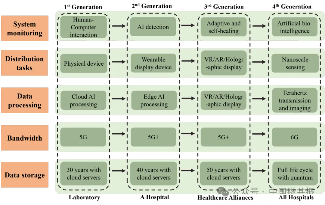 图3展示的是Cloud-MRI系统的四代发展路线,目前已经完成第一代工作 (智能云脑成像平台: https://csrc.xmu.edu.cn/CloudBrain.html),正在进行第二代系统的开发。其中第一代侧重于实验室或放射科级别的基础设施,主要通过将MRI数据加密并传输到云服务器中保存,以便于医生查看和处理。第二代将在医院内完善系统性能,采用MRI参数成像技术,支持命令行传输和自动监测,数据存储时间延长至40年,并引入边缘AI计算和5G+技术以提高传输效率。第三代将推动医师联盟间的发展,实现高分辨率的多核代谢定量信息,并利用虚拟现实、增强现实等技术向临床医生发送诊断结果和治疗计划。最终,第四代致力于覆盖所有医疗机构,采用先进的MRI传感器和量子存储技术,实现对人类生命周期的全面监测,结合6G技术实现毫秒级的网络传输延迟。这些发展将使MRI技术在诊断和治疗方面取得巨大进步,为医疗保健领域带来革命性的变化。