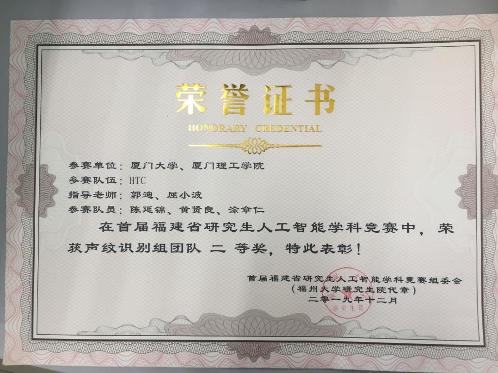 In December 2019, in the first Fujian Provincial Graduate Artificial Intelligence Discipline Competition, CSG students Zhangren Tu and other classmates Yanjin Chen and Xianliang Huang (tutor: Xiaobo Qu, Di Guo) won the second team of the license plate recognition group and voiceprint recognition group prize.